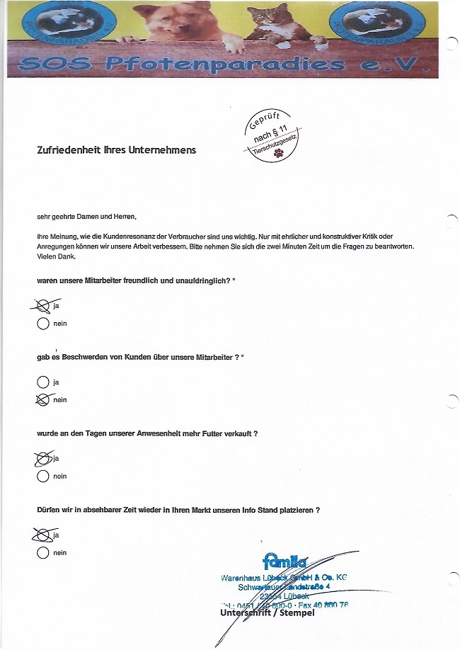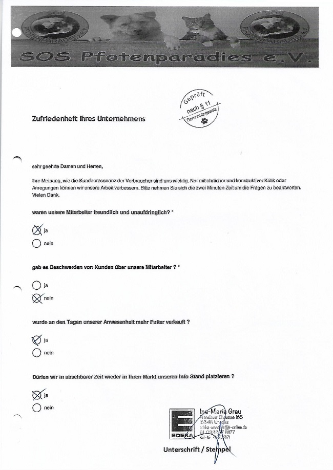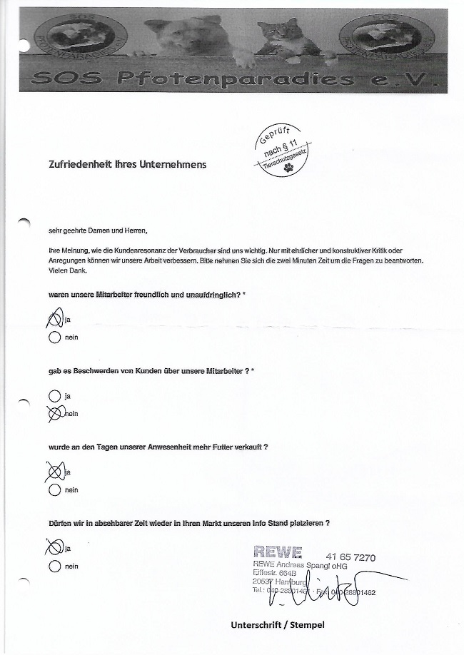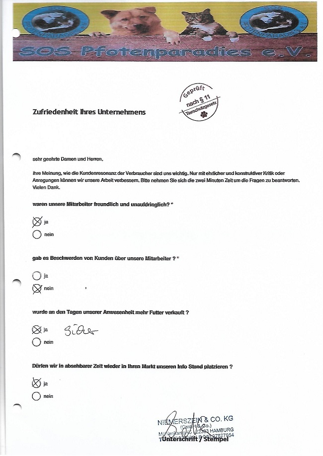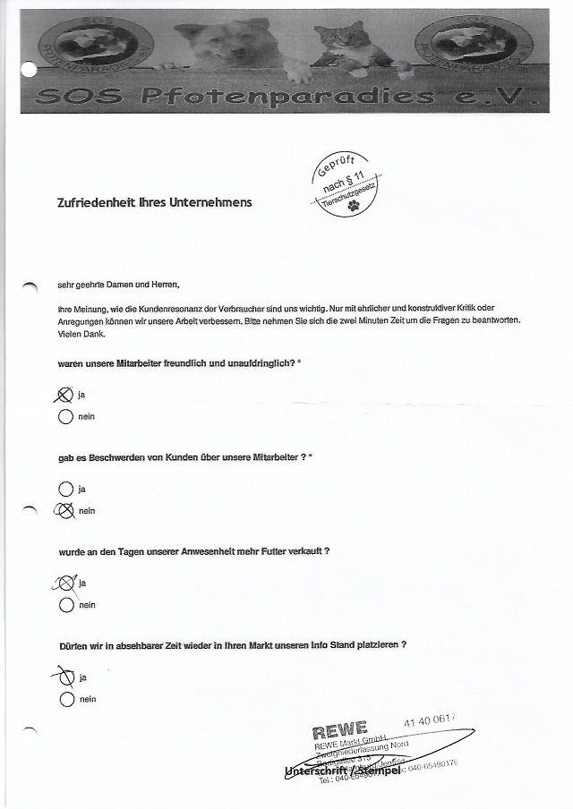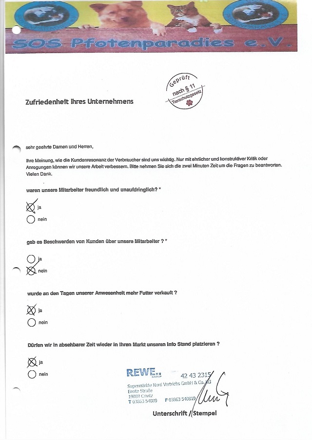 Um so mehr freut es uns bei vielen Märkten seit Jahren dem entgegengebrachte Vertrauen immer wieder zu gerecht zu werden. Wir generieren keine Verträge, keine Mitglieder am Stand. Wir sammeln ausnahmslos Futter oder einen kleinen Obolus in die Spenden Dose. Dies freundlich und unaufdringlich. Alle Spenden werden grundsätzlich in der jeweiligen Region verwendet.