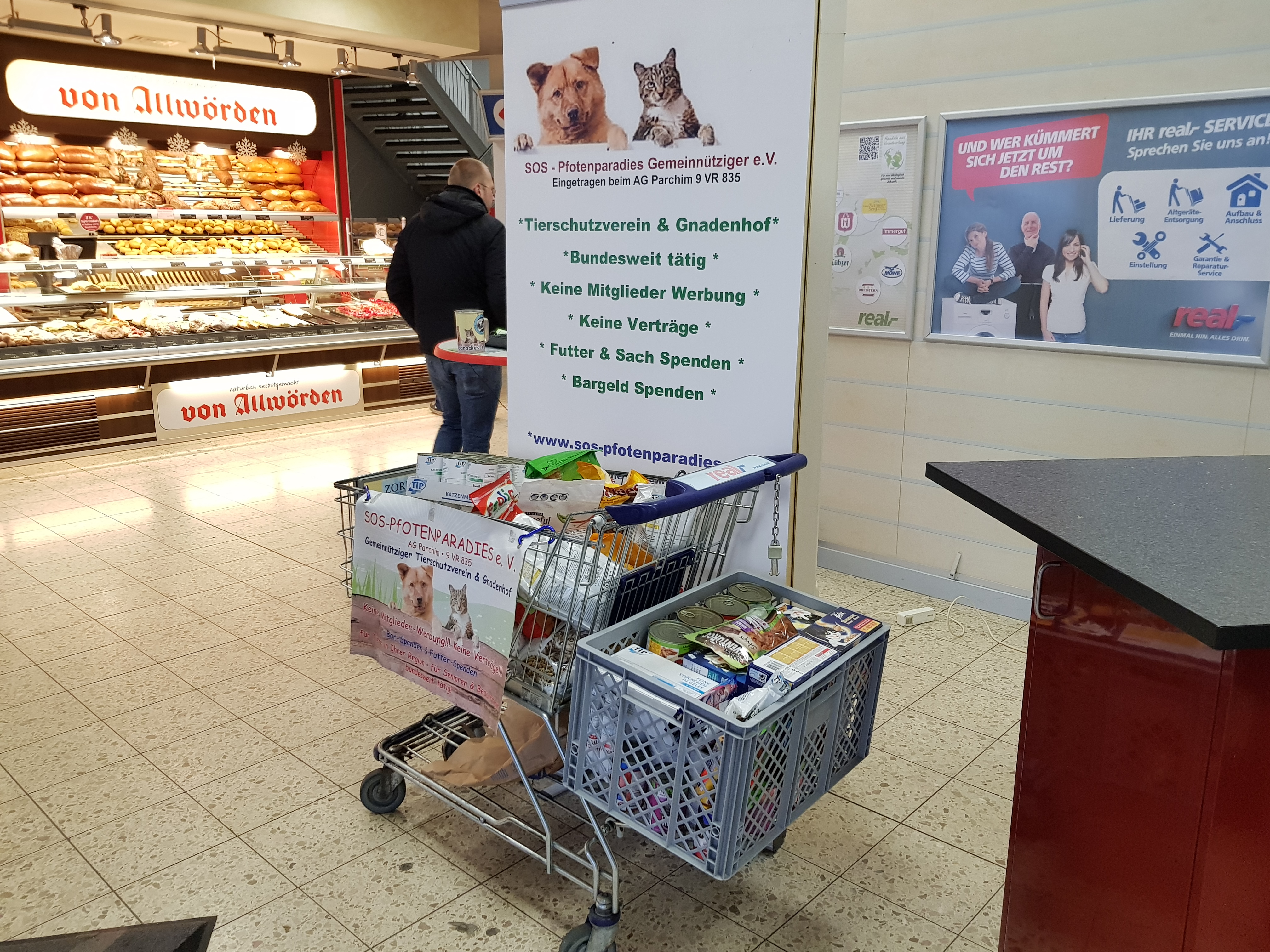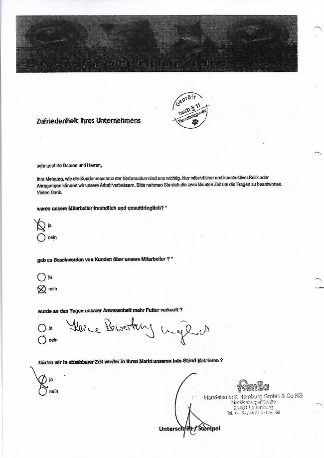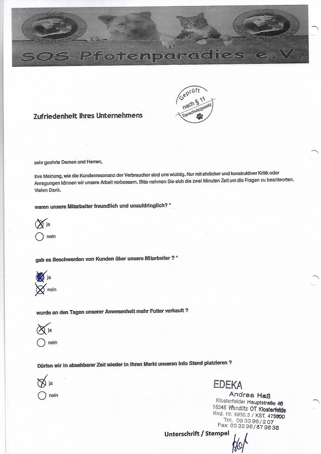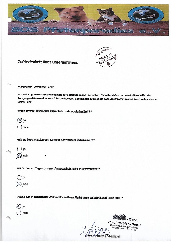 Um so mehr freut es uns bei vielen Märkten seit Jahren dem entgegengebrachte Vertrauen immer wieder zu gerecht zu werden. Wir generieren keine Verträge, keine Mitglieder am Stand. Wir sammeln ausnahmslos Futter oder einen kleinen Obolus in die Spenden Dose. Dies freundlich und unaufdringlich. Alle Spenden werden grundsätzlich in der jeweiligen Region verwendet.
